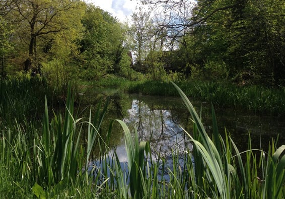 A pond near the entrance to the wood is a feature of the site and has a pond dipping platform and bridge. The pond has deep water at its centre, and towards the northern end it becomes shallower and has an extensive area of thick marshy growth.